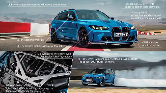 M3 CS 투어링은 M3 CS 세단과 M4 CS 쿠페의 성능을 그대로 이어받은 모델이다. 3.0리터 트윈 터보 직렬 6기통 엔진을 탑재해 최고출력 550마력, 최대토크 65.8kg·m를 발휘한다. 이는 기존 M3 투어링보다 20마력 높은 수치다. 변속기는 8단 자동이며, 기본적으로 사륜구동이 적용됐지만, 후륜구동 모드도 지원해 운전의 재미를 더했다.