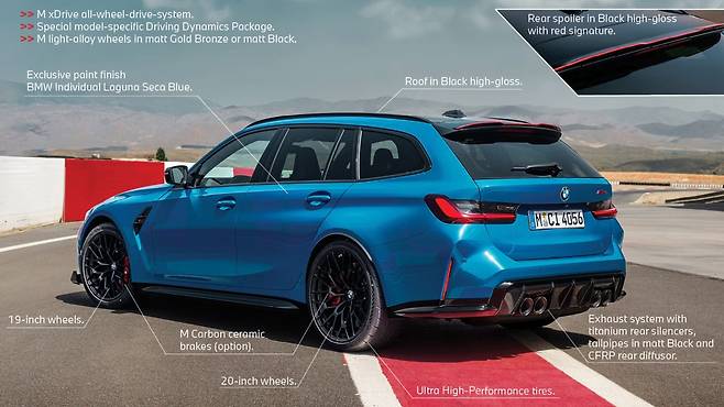 디자인은 기존 M3 투어링보다 공격적이다. 전면부에는 블랙 레터링과 레드 액센트가 적용된 프레임리스 M 전용 키드니 그릴이 자리 잡았으며, 노란색 LED 헤드램프가 레이싱카 느낌을 강조한다.