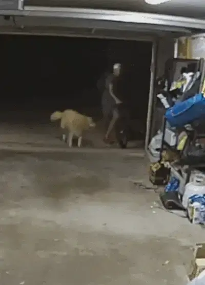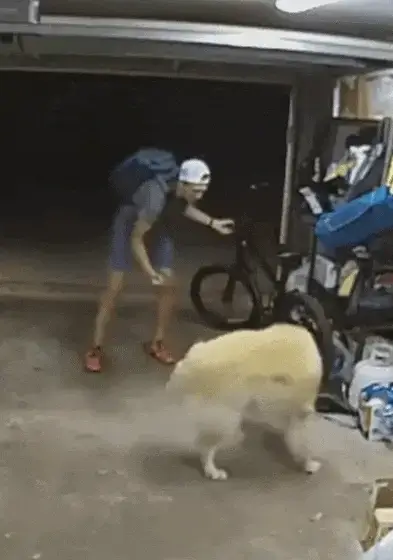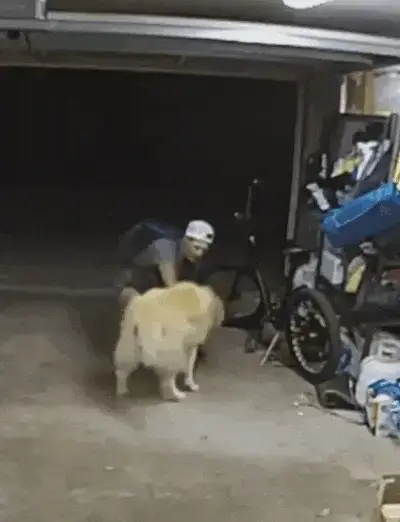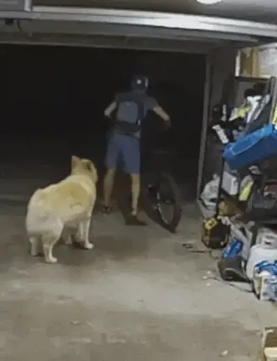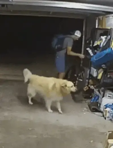 강아지가 다가가자 도둑은 훔치려던 자전거를 내려놓는 듯했습니다.