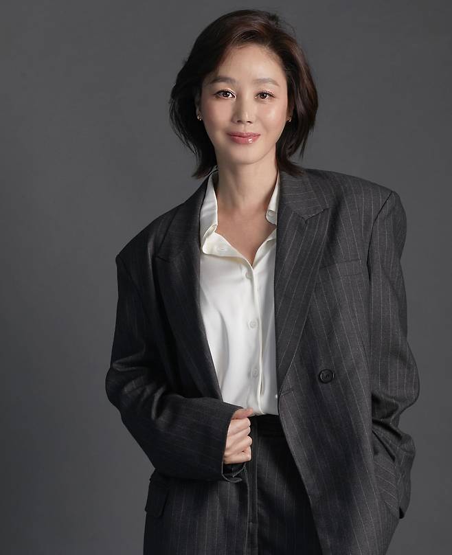 김성령이 그레이 핀스트라이프 수트를 입고 프로페셔널한 매력을 발산하고 있다. 오버사이즈 실루엣의 재킷과 화이트 셔츠의 조합은 클래식함과 현대적 감각을 동시에 보여준다. 특히 어깨 라인을 강조한 테일러링이 돋보이는 이 수트는 김성령의 세련된 이미지와 완벽하게 어우러지고 있다. 짧은 단발 헤어스타일과 내추럴 메이크업으로 마무리한 이 룩은 강인하면서도 여성스러운 그녀만의 양면성을 효과적으로 표현하고 있다.