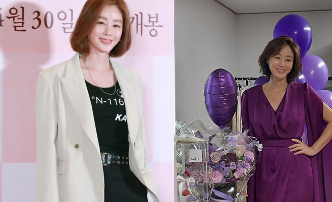 김성령이 보라색 새틴 드레스를 입고 축하 행사에 참석한 모습이다. V넥 라인의 우아한 실루엣과 함께 풍성한 소매 디테일이 돋보이는 이 의상은 동일한 컬러의 풍선과 꽃다발로 꾸며진 공간과 완벽한 조화를 이루고 있다. 특히 김성령은 자연스러운 웨이브 헤어와 최소한의 액세서리로 드레스의 화려함을 더욱 돋보이게 하는 스타일링을 선보이고 있다. 그녀의 여유로운 미소와 함께 연출된 이 패션은 축하받는 자리에 걸맞은 품격을 보여주고 있다.
