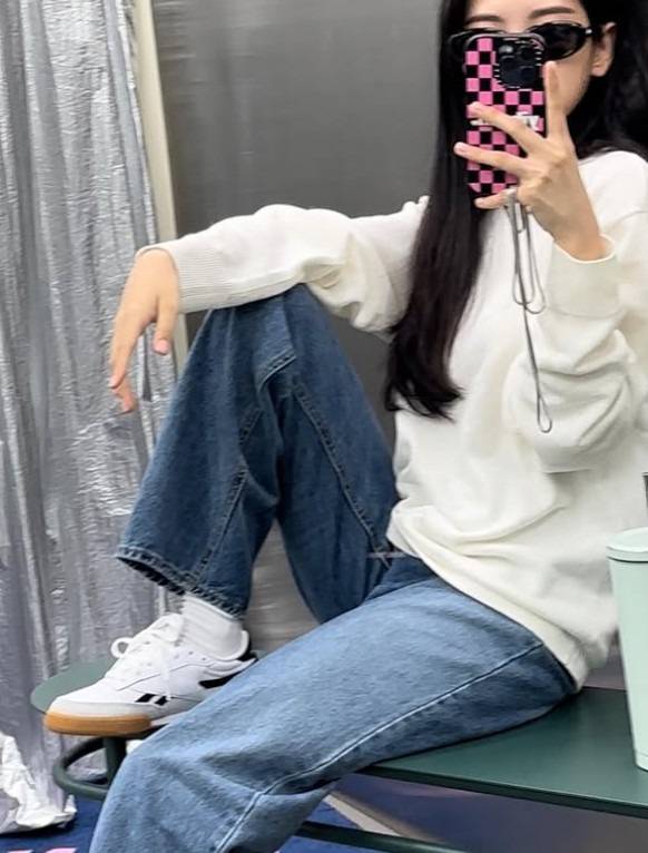 무난한 중청 컬러 데님 진. 일자로 떨어지는 핏이 다리를 길어 보이게 해요.