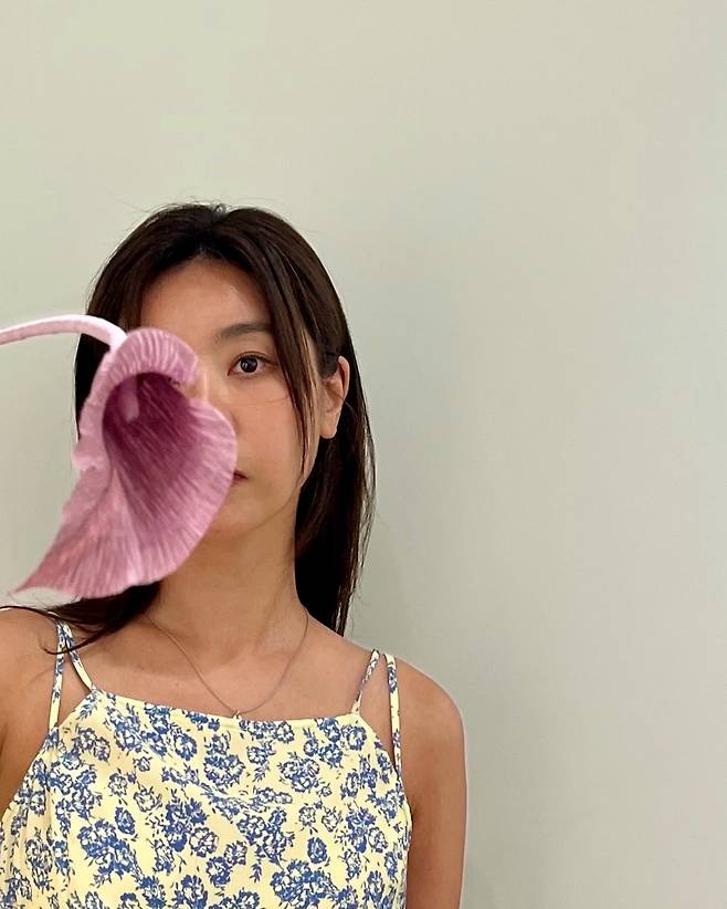 잔잔한 꽃무늬와 내추럴한 헤어스타일이 청순한 매력을 한층 더 돋보이게 했어요.