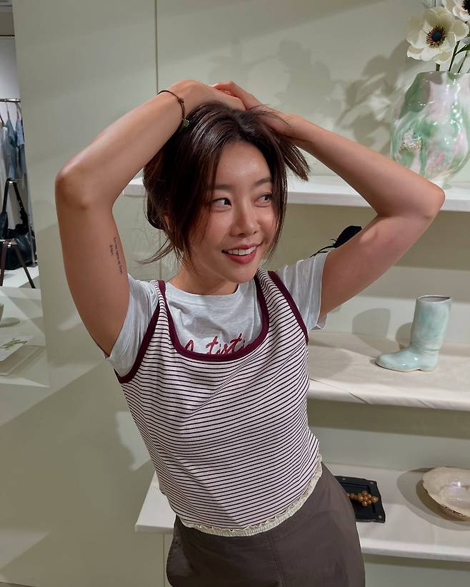 이어진 사진에서는 스트라이프 민소매와 티셔츠를 레이어드한 내추럴하면서도 귀여운 데일리룩까지 선보였어요.