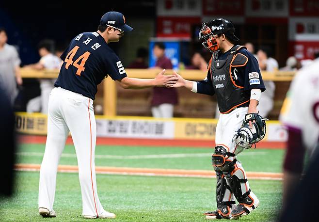 27번째 아웃을 잡아낸 뒤다. 파트너(포수)와 합을 맞춘다. 악수하며 손을 잡는다. 그리고 허공을 향해 손가락 총을 발사한다.