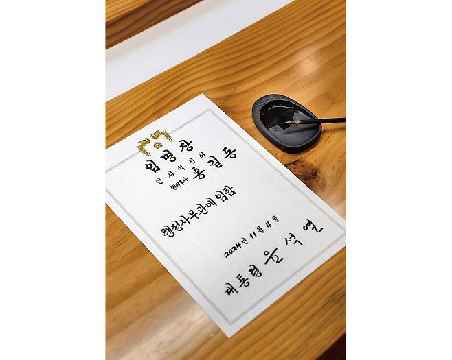 임용장에는 진급하는 공무원을 격려하는 대통령의 마음이 담겨 있지 않나요. 내 손이 대통령의 손을 대신해 글씨를 쓰니까 그 마음을 기억하며 쓰겠다는 의미였습니다. 그래서 쓸 때마다 붓이 무겁습니다.