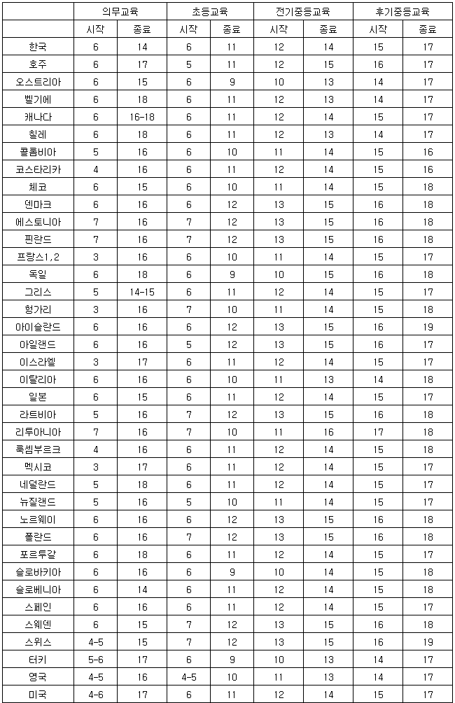 [표] OECD 의무교육, 교육단계별 시작연령 및 종료연령