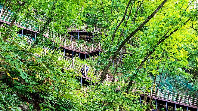정차장에서 이어지는 데크길은 약 870m 길이로 완만하게 조성되어 있다. 이 길을 따라 이동하면 삼악산 스카이워크에 도달하게 된다.