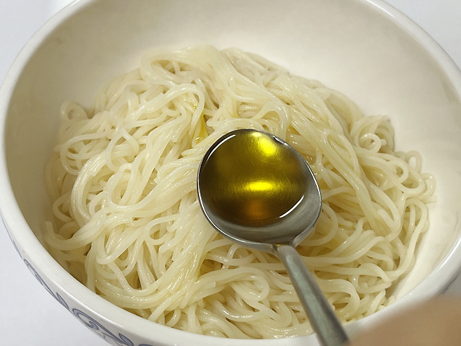 국수 면발에는 전분 성분이 많이 있어 그냥 두면 쉽게 면이 퍼지고 서로 달라붙습니다.