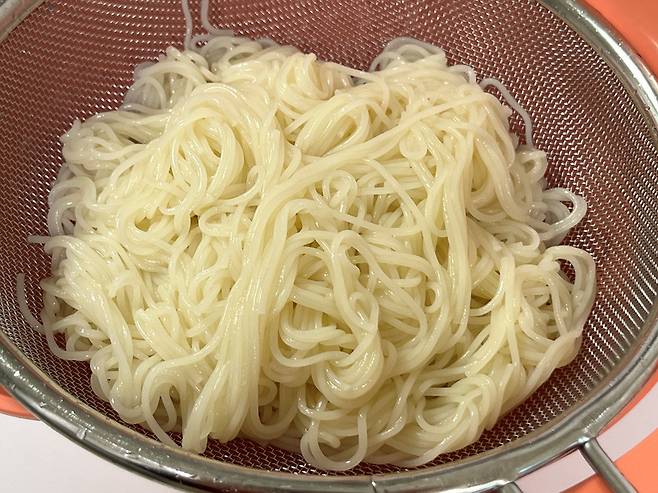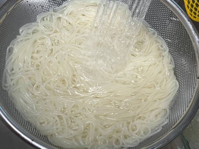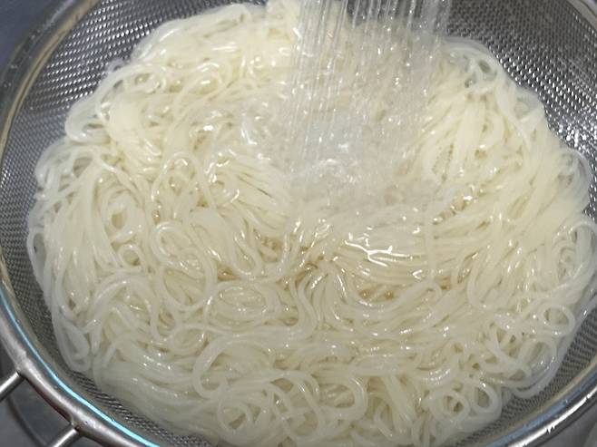 찬물로 최소 3~4회는 바락바락 씻어내야 전분기가 없어집니다. 면발을 찬물로 헹궈야 식감 또한 탱탱하며 쫄깃해집니다.
