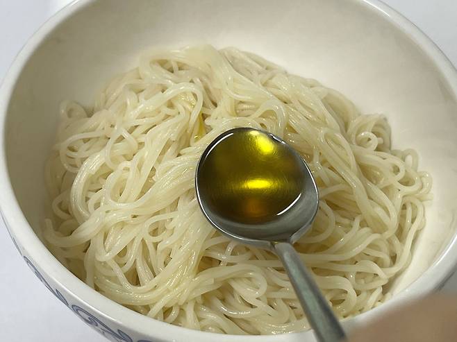 참기름이나 들기름을 넣으면 기름막이 생겨 면이 서로 들러붙지 않게 됩니다.