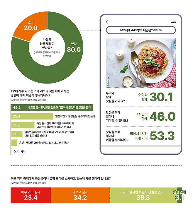 맛집 정보가 넘쳐나는 요즘 MZ세대는 뜨는 맛집을 좋아할까요? 단골 맛집을 더 좋아할까요? 의외로 설문 참여자의 80%가 나만의 단골 맛집이 ‘있다’고 답했어요.