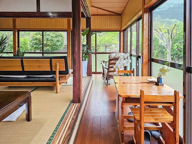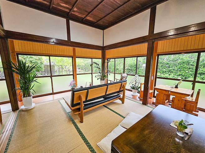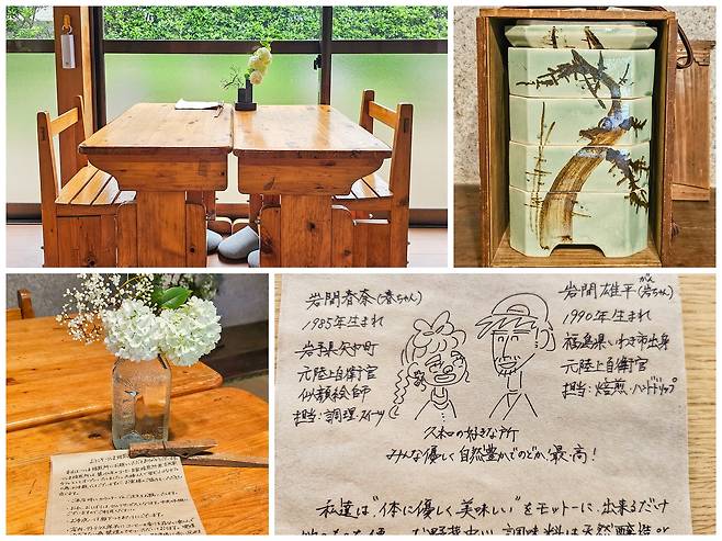 고즈넉한 료칸에 들어온 듯 거실 한가운데 놓인 낮은 테이블에 자리를 잡으니, 창밖으로 먼 산과 나무, 마당의 풍경이 한눈에 들어왔다. 가는 빗줄기가 차분한 분위기를 한층 더했다. 테이블 위에 놓인 생화, 부부의 소개를 담은 캐리커처 카드, 일본식 소품들로 가득하던 장식장과 책장으로 아기자기하게 꾸민 내부는 일본 현지에 사는 친구네 집같이 아기자기하고 친숙한 느낌을 주었다.
