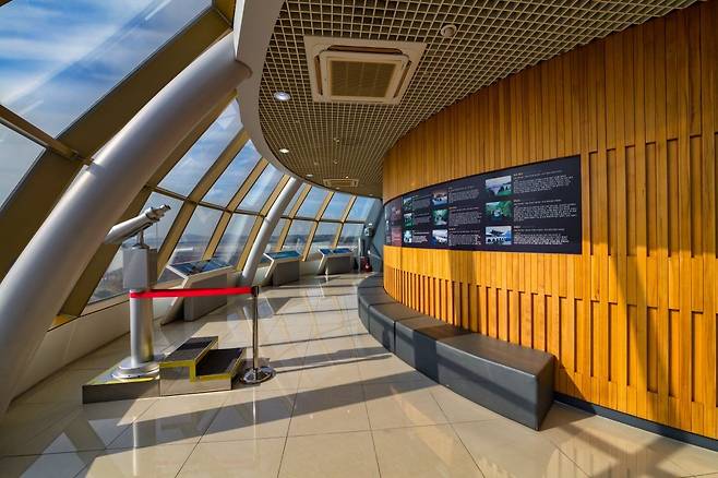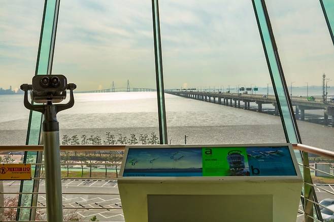 하이라이트는 기념관 전망대 공간입니다. 옥상에 마련된 조망 구역에서는 인천대교의 주탑과 해상 위로 뻗은 교량 전체를 시원하게 내려다볼 수 있습니다.