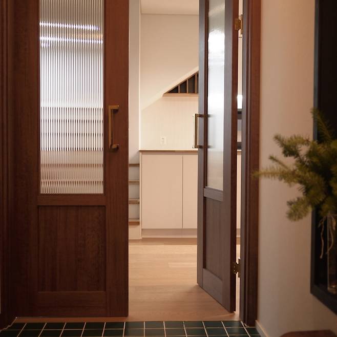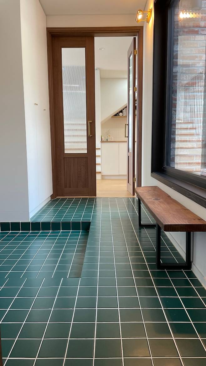 현관은 본채와 별채를 연결하고 있어서 실내와는 이질적인 느낌을 주고 싶었어요. 그래서 초록색 타일로 전체를 연결했습니다.