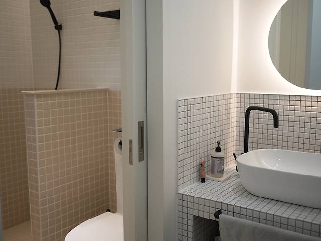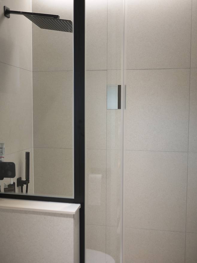 샤워실은 심플하게 600각 타일로! 샤워 부스와 수전은 블랙으로 맞춰주었습니다.