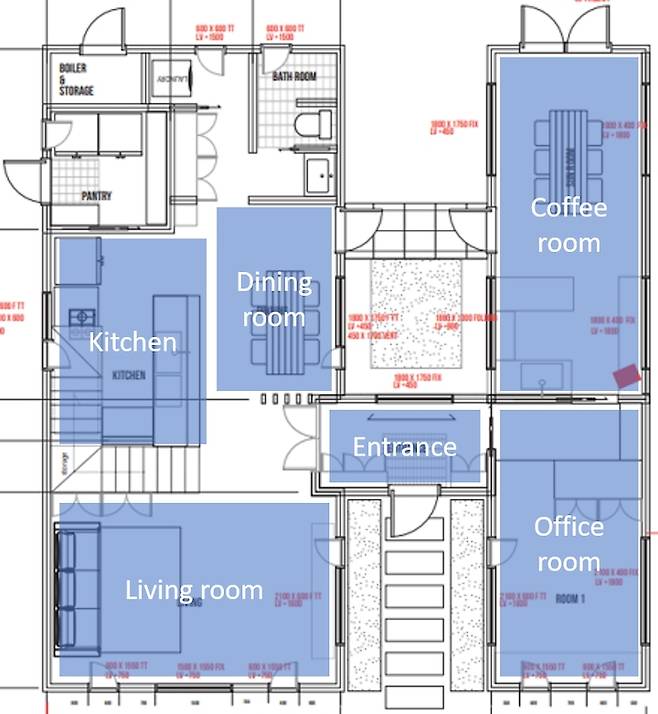 저희 집은 본채와 별채로 나뉘는데요. 사진은 본채의 도면입니다. 저희는 집을 설계할 때 공간 분리에 대해 많이 고민했어요. 아파트는 하나의 공간이 여러 목적으로 쓰이다 보니 독립성이 떨어지는 점이 늘 아쉬웠었거든요. 그래서 가족이 생활하는 본채와 저와 남편의 개인 공간이 있는 별채로 분리해서 H자 형태로 설계하였어요. 그리고 남편이 원하던 중정도 만들었어요.