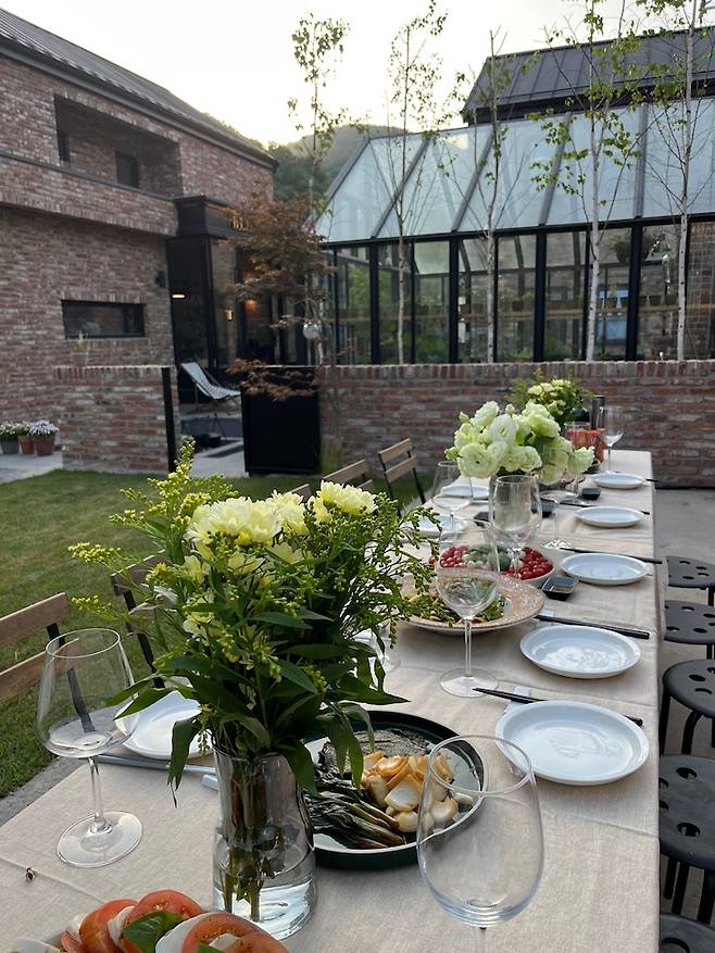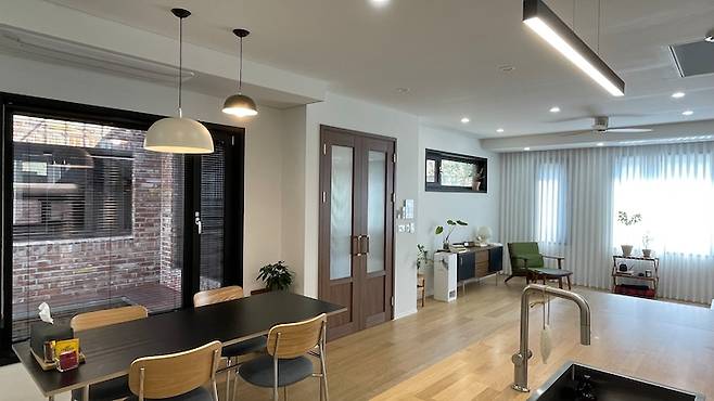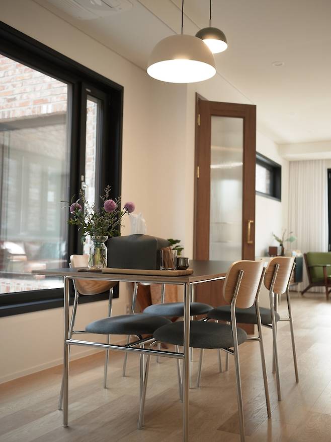 주방 건너편으로는 다이닝 공간이에요. 별채와 마주 보는 창으로 벽돌담이 보이니 꼭 레스토랑에 온 기분이 들어요.