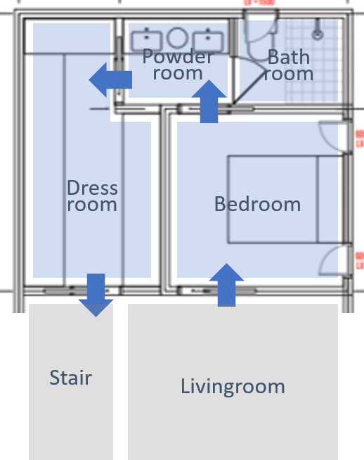 본채 2층의 도면이에요. 부부 공간과 거실, 계단 등이 표기되어 있는데요. 부부 공간은 철저하게 저희의 라이프스타일에 맞춰서 나누었습니다. 남편은 아침잠이 없고 출근이 빨라 5시-6시 사이에 일어나는데, 저는 상대적으로 늦게 일하는 경우가 많고 아침잠이 많은 편이거든요.. 남편이 일어나서 씻고, 옷 갈아입고 준비하는 잠이 깨버리는 애로사항이 있었어요. 그래서, 안방을 침실/샤워실/파우더룸/드레스룸으로 쪼개고 순환형 구조를 만들었습니다.