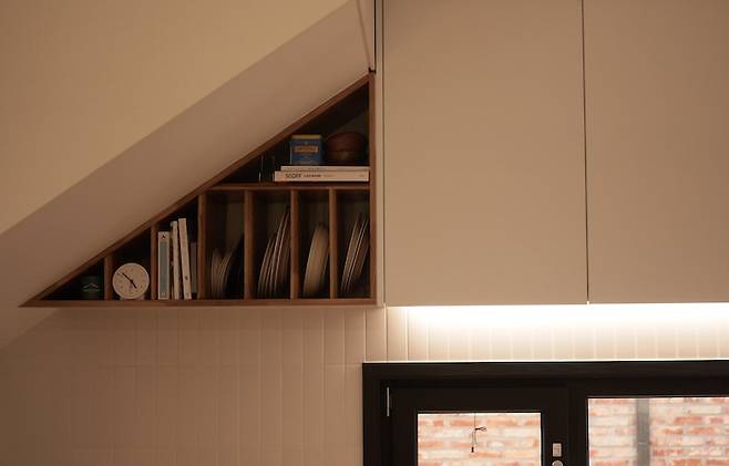 접시 수납장은 꼭 만들고 싶어서 계단 아래 자투리 공간에 딱 맞춰 세모 형태로 제작해서 넣었어요. 접시는 포개놓는 것보다 옆으로 세워두는 것이 꺼내기가 더 편하더라구요.