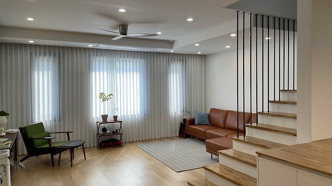 1층 거실입니다. 남쪽으로 창이 크게 나 있어 낮에는 화사하게 햇살이 들어요. 그런 햇살을 잘 느끼고 싶어서 커튼도 심플하게 도톰한 차르르 쉬폰으로 했는데 대만족이에요.