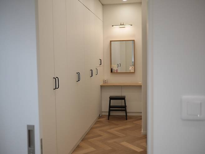 드레스룸이에요~ 양쪽으로 수납장을 꽉꽉 채웠고, 스타일러도 두었습니다. 안쪽에는 작은 테이블을 만들어서 화장대로 쓰고 있어요.