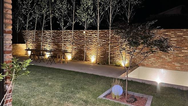 마당은 집 뒤쪽 북향으로 두어, 잔디밭과 수영장, 긴 야외 다이닝 공간을 만들었어요.