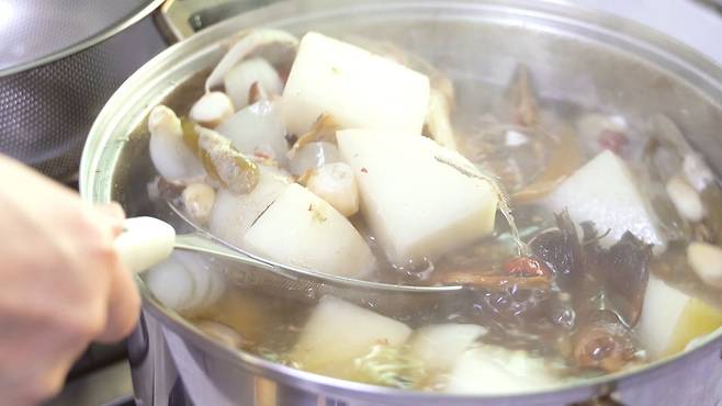 총 60분 동안 끓인 후 모든 재료를 건져 주세요.