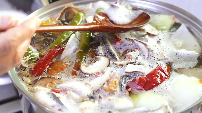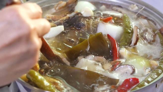 고추씨 1/4컵, 손질한 멸치 60g, 디포리 10마리, 북어대가리 2개, 청주 1/4컵, 대파뿌리 7개, 무 600g, 청양고추 5개, 건청양고추 3개, 양파 1개, 마늘 10알, 물 6L, 자른 건표고버섯 한 줌, 통후추 20알, 다시마 손크기 4조각