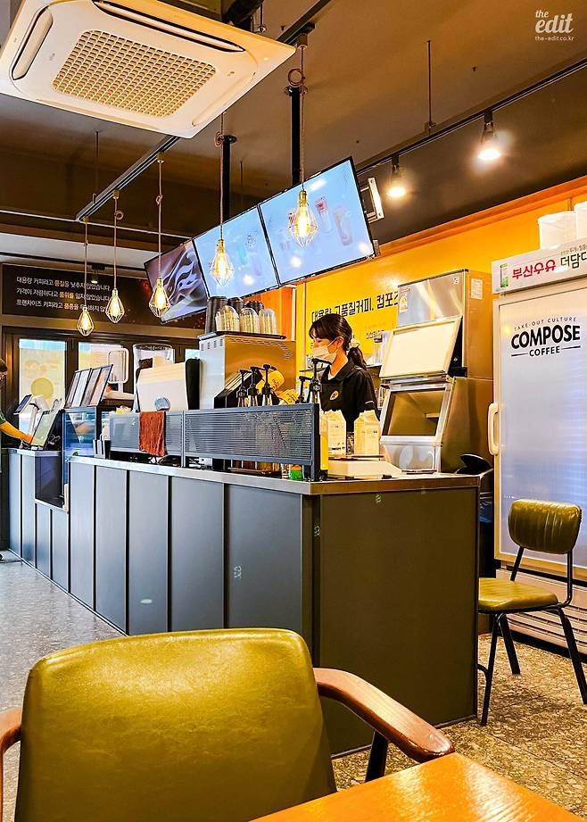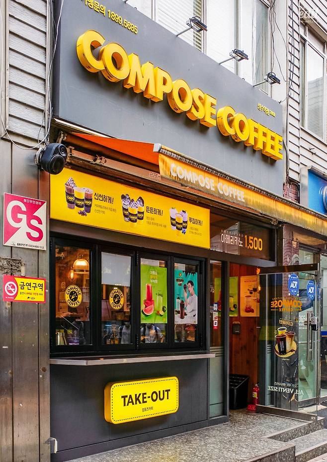 메가커피와 함께 양대산맥으로 손꼽히는 컴포즈커피는 여러모로 메가와 비교가 된다. 대부분의 매장이 서로 가까운 위치에 있고, 시스템도 유사하다. 전형적인 미투 방식의 영업이지만 자체적으로 로스팅한 커피 원두를 사용하고, 메가커피보다 대형 매장이 많다는 게 차이다. 컴포즈 커피는 성수역 바로 앞에 있는 매장을 방문했다.