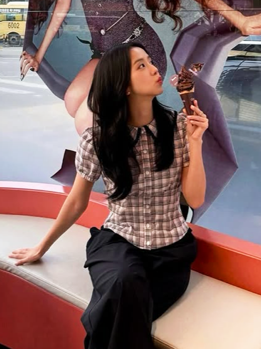 이번 스타일링의 포인트는 깔끔한 체크 패턴 블라우스와 여유로운 핏의 블랙 팬츠 조합.