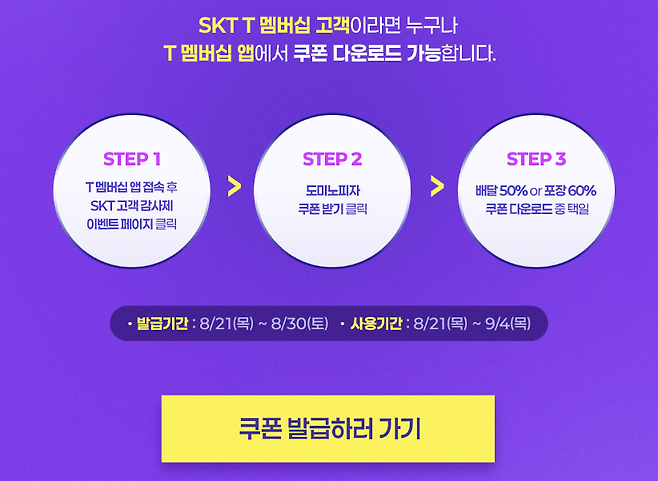 2025년 8월, SK텔레콤은 T멤버십 고객을 대상으로 도미노피자 할인 행사를 진행 중입니다. 이른바 ‘고객감사제’라는 이름으로, 포장 주문은 60%, 배달 주문은 50%의 파격적인 할인 혜택을 제공합니다. T멤버십 앱에서 쿠폰을 발급받고, 도미노피자 홈페이지나 앱에서 최종 결제 단계에 쿠폰번호와 프로모션 코드를 입력하면 할인이 적용됩니다. 할인 쿠폰 사용 기간은 2025년 8월 21일부터 9월 4일까지입니다.