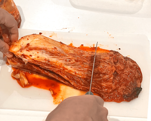 먼저 김치를 잘게 다져 준비한다. 김치는 볶음밥에서 가장 중요한 재료이기 때문에 너무 크게 썰기보다는 잘게 다지는 것이 좋다. 그래야 밥과 함께 볶았을 때 김치의 맛이 고르게 퍼진다. 여기에 다진 대파와 다진 마늘을 준비한다.