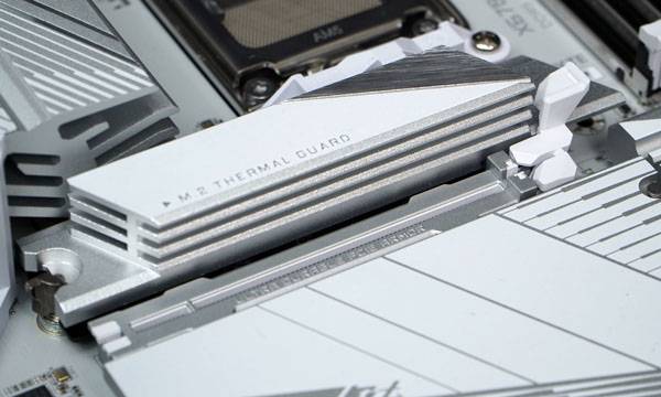 그래픽 카드 슬롯 상단에 위치한 M.2 슬롯도 PCIe 5.0 지원 고성능 SSD에 최적화된 쿨링 성능을 제공하기 위해 일반 M.2 방열판에 비해 높아진 두께로 쿨링 면적을 극대화하고 백플레이트에도 써멀 가드를 추가하였다. 이지 래치 플러스(EZ-Latch Plus) 방식으로 나사와 드라이버 없이 레버만 돌려서 방열판을 분리하고 SSD를 설치할 수 있다.