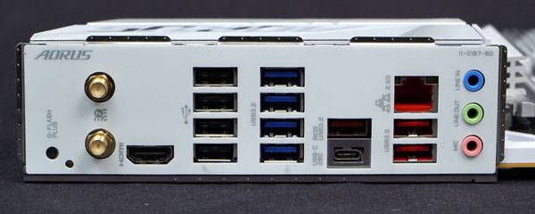 후면 I/O 구성은 좌측부터 CPU와 메모리 없이도 바이오스(BIOS) 업데이트가 가능한 Q-Flash Plus 버튼, 2개의 무선 안테나 단자. 내장 그래픽 출력을 위한 HDMI 포트, 4개의 USB 2.0 포트, 4개의 USB 3.2 Gen1 Type-A 포트, 3개의 USB 3.2 Gen2 Type-A 포트, 1개의 USB 3.2 Gen2x2 Type-C 포트, RJ-45 LAN 포트, 그리고 3개의 오디오 잭이 배치되어 있다.
