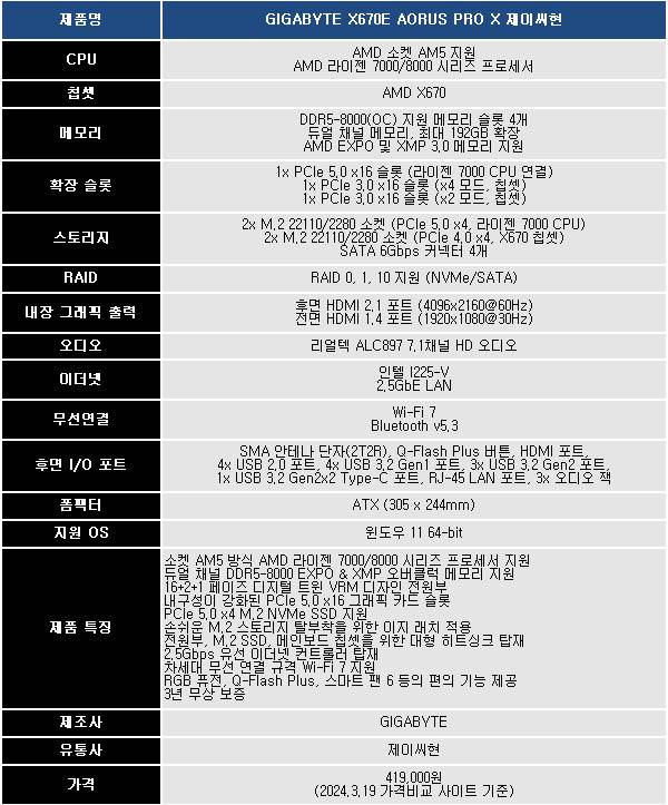 기가바이트 X670E 어로스 프로 엑스 제이씨현 메인보드(이하 X670E 어로스 프로 X)는 30.5 x 24.4mm 크기의 ATX 폼 팩터에 깔끔한 화이트 컬러 디자인, 전원부와 스토리지, 메인보드 칩셋에 달린 든든한 방열판(히트싱크)이 돋보이는 제품이다.