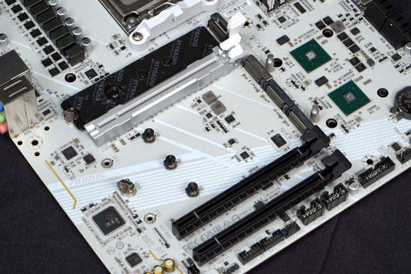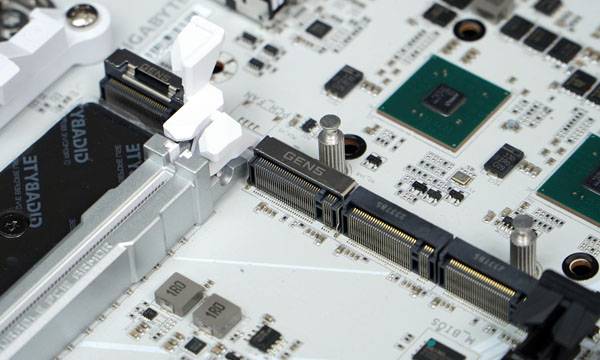 그래픽 카드 슬롯 하단에 위치한 3개의 M.2 슬롯은 하나의 거대한 방열판을 공동으로 사용하는 구조로 만약 3개의 SSD를 모두 장착하지 않는다면 개당 방열 면적이 늘어나는 효과도 기대할 수 있다. 역시 이지 래치 구조로 되어 있어 나사 없이 손쉬운 SSD 설치가 가능하다. 그래픽 카드 슬롯 위아래에 배치된 2개의 PCIe 5.0 지원 M.2 슬롯은 일체형 스테인리스 스틸 차폐 설계로 내구성을 높이고 신호 무결성을 극대화한다.