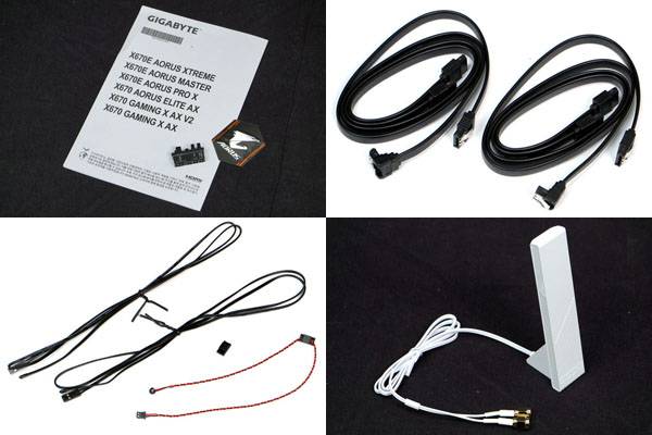 기가바이트 X670E 어로스 프로 X 제이씨현 구성품으로는 메인보드와 빠른 설치 가이드, 어로스 로고 스티커, G-커넥터, SATA 케이블 4개, 온도 감지 케이블 2개, 소음 감지 케이블 1개, Wi-Fi 7 안테나가 포함되어 있다. 기가바이트 국내 공식 수입사인 제이씨현으로부터 3년 무상 보증을 받을 수 있다.