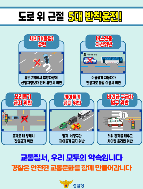 경찰이 규정한 ‘5대 반칙 운전’은 ▲새치기 및 불법 유턴 ▲교차로 꼬리물기 ▲끼어들기 ▲버스전용차로 위반 ▲비긴급 구급차 불법 운행 등 다섯 가지다.