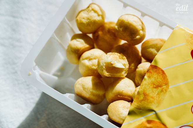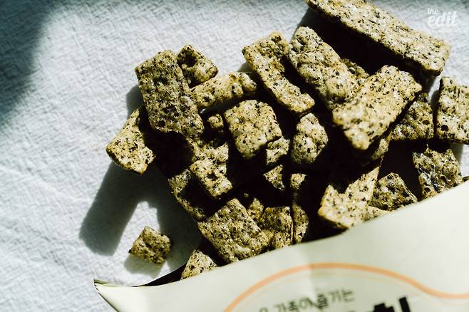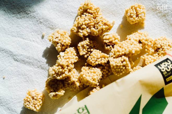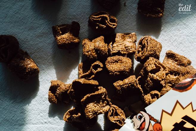본가에 내려가면 인스턴트 과자가 없다. 건강을 생각하는 어머니 아버지 덕분에 과자, 라면 같은 음식은 구경도 못한다. ‘단일한’ 씹을 거리는 뻥튀기나 강정. 나는 그것들을 보며 ‘짜지도 달지도 않은 것들…’이라고 무시하다가 ‘마침내’ 손을 댄다. 그리고 몇 분 이내 한 주먹씩 쥐어 입 안에 털어넣는 나를 발견하게 된다. 가까운 편의점에서 쌀 뻥튀기를 살 수 있다는 건 소소한 행복이다. 농협이 100% 국내산 쌀을 써서 만들었다는 것에서 신뢰감이 가고, 레트로한 포대 패키지에 정감이 간다. 맛은 심심하지만, 그 맛에 먹는 것 아닌가. 쌀로 만들었기 때문에 포만감을 느낄 수 있다는 것도 장점. 가격은 2,800원.