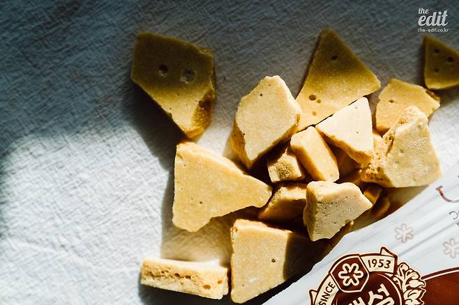 진짜 달고나다. 달고나 맛 과자가 아니라 찐 달고나다. 그 점이 가장 만족스럽다. 오랜만에 달고나 하나 먹어보고 싶은 순간, 내 근처에서 달고나 장수를 만날 확률은 0%에 가깝지 않을까. 멀리 갈 필요 없이 올리브영에 가면 진짜 달고나를 먹어볼 수 있다. 쓴맛인 듯 단맛인 듯 싶은 달고나 특유의 소다 맛까지 느낄 수 있다. 어릴 때 마음껏 못 먹어본 달고나를 왕창 먹어보고 싶다면 바로 이 과자를 사면 된다. 단, 많이 달기 때문에 한 봉지 이상은 먹기 힘들 거다. CJ제일제당의 백설과 협업한 제품으로 몸에 흡수가 덜 되는 백설 자일로스 설탕을 사용했다. 가격은 2,600원.