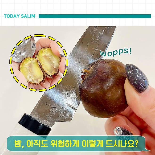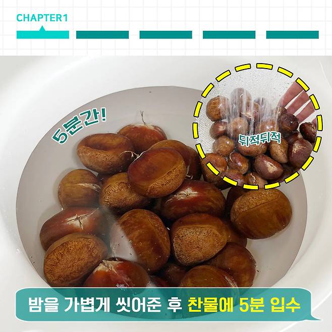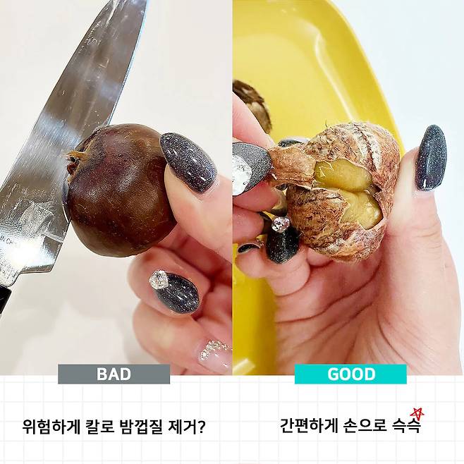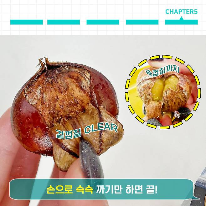 이제는 찬-뜸-찬 기법만 기억하면 되니까, 쉽고 안전하게 맨손으로 밤껍질 깔 수 있겠죠?