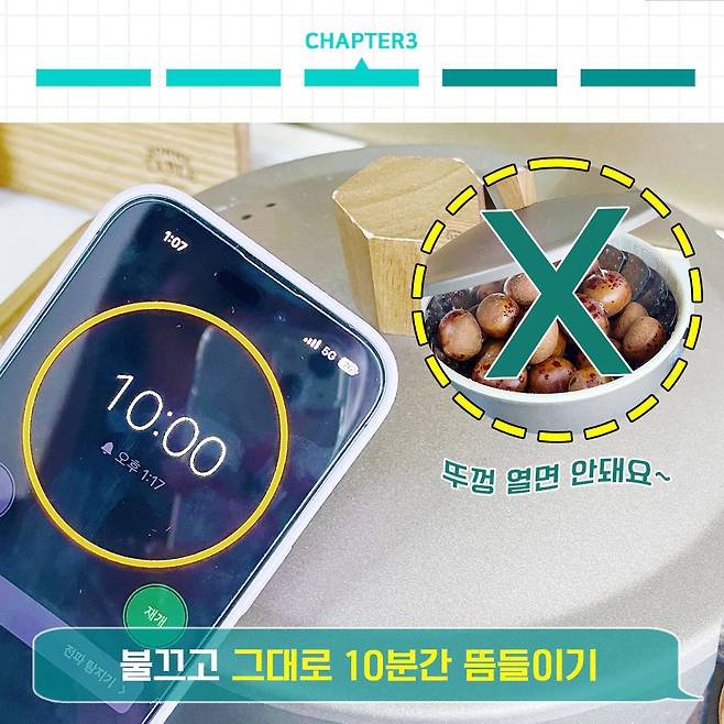 잠깐 WAIT!! 여러분들 20분 지났다고 밤 뚜껑 바로 연 거 아니죠? 찜기 뚜껑 열면 절대 안돼요! 여기가 바로 밤 껍질 쉽게 까는 두 번째 핵심 꿀팁이거든요. 바로바로 뜸들이기!
