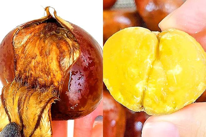 과연 맨손으로도 딱딱한 밤의 겉껍질이 까질까요? 와. 진짜 맨손으로 힘 들이지 않고 밤껍질이 까져요. 대충격!