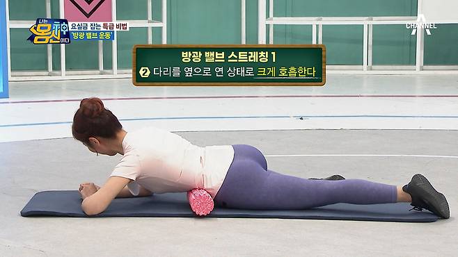 첫 번째 운동은 폼롤러를 이용해 복부와 골반 근육을 이완시키는 방법인데요.