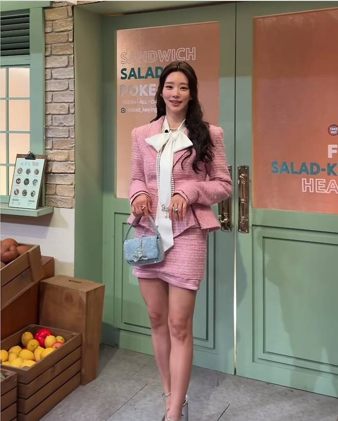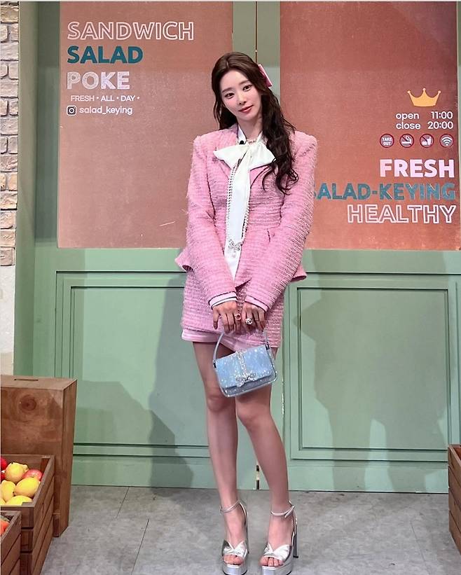 진주 장식이 더해진 블루 미니백은 룩에 고급스러운 포인트를 더했고 핑크 헤어리본과 실버 플랫폼 힐까지 더해져 ‘러블리함의 교과서’ 같은 착장을 완성했습니다.