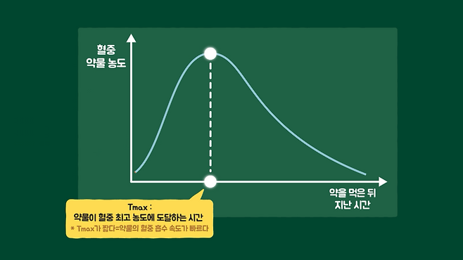 이해를 돕기 위해 약물의 흡수 과정을 살펴보겠습니다. 경구 투여 약물은 대부분 위에서 용해된 뒤 소장에서 흡수되고, 간을 거친 뒤 전신에 퍼집니다. 이 과정에서 약물이 혈중 최고 농도에 도달하는 시간을 Tmax라고 하고, 약물의 혈중 흡수 속도를 간접적으로 반영합니다.