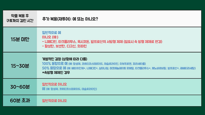 다만, 이 표도 참고용이고, 실제 판단은 약 종류와 제형, 아이 상태, 토사물에 약이 보였는지 등 복합적으로 확인해야 합니다.