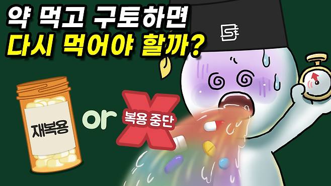 약을 복용 '직후' 구토했다면 체내에 충분히 흡수될 틈도 없이 빠져나가 버리므로 약을 재복용해야 하는 경우도 있습니다.