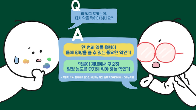 결론부터 이야기하면 약 먹고 구토했을 때 다시 복용해야 하는지의 판단은 약동학(Pharmacokinetics)적인 관점에서 “한 번의 약물 용량이 몸에 영향을 줄 수 있는 중요한 약인가”와 “약물이 체내에서 꾸준히 일정 농도를 유지해 줘야 하는 약인가”라는 두 질문에 대한 답으로 할 수 있습니다.